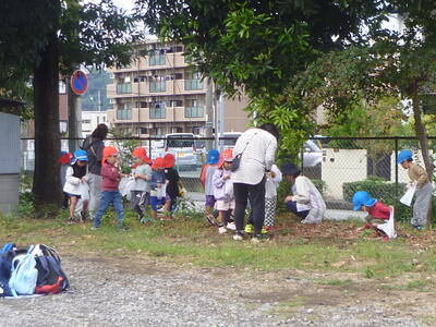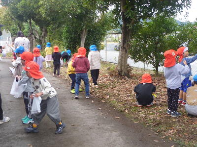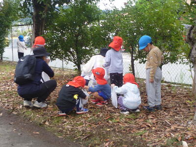 3校時に、松本幼稚園の園児と先生が、長伏小にどんぐり拾いに来ました。ビニル袋にお気に入りのどんぐりを一生懸命集めていました。「すごく、かわいいどんぐりを見付けたよ。」「帽子が付いているよ」「たくさん拾ったよ」など、話しかけてくれました。園に持ち帰り、遊びに使うようです。