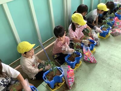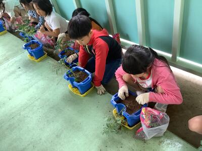 空の鉢に、土を入れ、苗を立てて植えていきます。