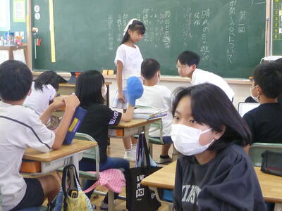 国語科の授業では、「お礼文の書き方」について学習しました。お礼文の冒頭に、季節の挨拶を入れるということを学んだ子ども達。「蚊に刺される季節になりました」「かえるが多い季節になりました」等、身近な例をたくさん考えていました。ただ、目上の方に対するお礼文ということなので、教科書の例を参考にしながら再考しました。子ども達の意見を聞きながら、子どもの達ならではの視点に新鮮さを覚えました。