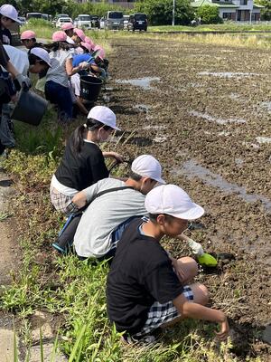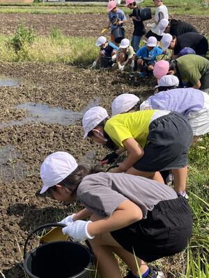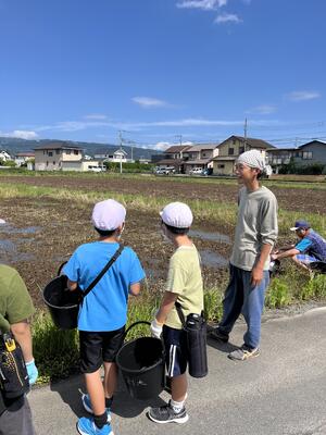 5年生は、一人一人、ばけつで稲の栽培をしています。先日、稲を植えました。今日は、その稲の様子を見ていました。鳥に稲を持って行かれたり、稲が倒れたりして、なかなか上手く育っていない様子も見受けられました。さらに、なめくじを発見し、歓声のような悲鳴のような声も聞こえてきました。上手くいかないことから、課題も発見できます。水の量や日当たりについても、気になっていることがありそうです。
