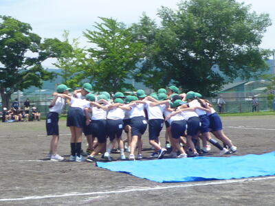 4年生は、じゅうたん(ブルーシート)が早くゴールした方が勝利です。グループで息を合わせて、じゅうたんを運びます。