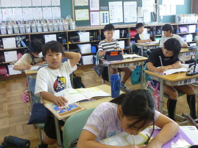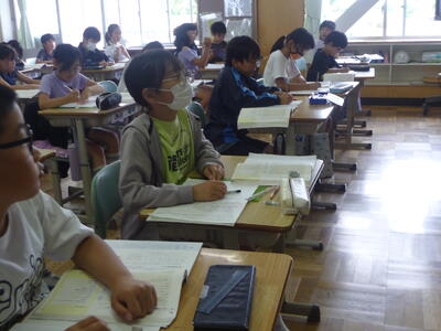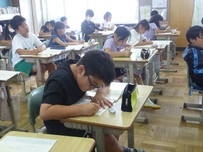 4年生は、新しい漢字を学習しました。筆順は、そら書き(子ども達は「空中ペン」と言います)を何回かしてから、ドリルに鉛筆で書き込んでいきました。短文づくりも行いました。
