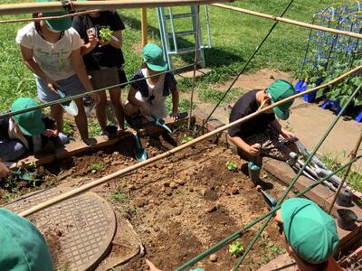 生活科の学習で、1年生はあさがお、2年生はミニトマト、きゅうり、えだまめ、なす等の夏野菜を育てています。毎日、自分の鉢だけではなく、学年の野菜園にもお水をあげています。だんだん、大きく育ち、実も付けてきました。子ども達は、持ち帰っているようです。