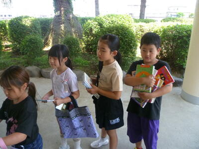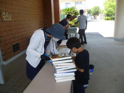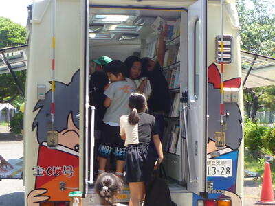 昨日のような雨天だとジンタ号は来ませんが、今日は晴れたので予定どおり来ることができました。たくさんの子ども達が、本を入れる袋を持って借りに来ました。
