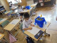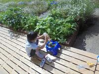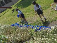 5月18日(水)。1年生がアサガオの観察をしています。「ふたばがでたよ!」と嬉しそう。ペットボトルで一生懸命水やりしています。きれいな花が咲くのが楽しみですね。