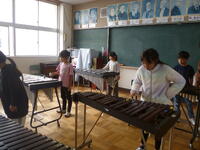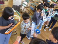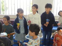 「こぎつね」の曲を練習していました。鍵盤ハーモニカ、鉄琴、トライアングル、ハンドベルなど楽器を役割分担し、担当の楽器で演奏しました。最後は、みんなで合わせました。練習の成果が出ていて、とても上手でした。