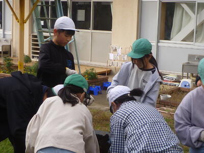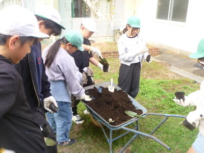 委員会活動の時間に、花の苗のポットを用意しました。きれいに咲くのは春になってからです。大切に育てていきたいです。