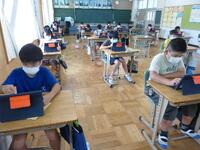 4年生音楽の授業です。ヘ音記号の楽譜の階名を書いています。タブレットを使ってテスト中です。
