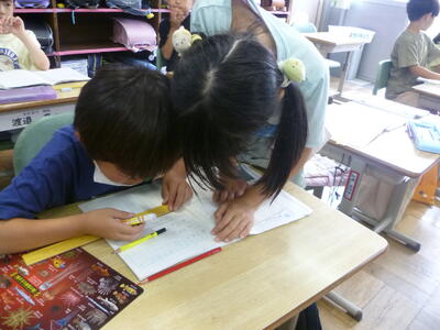 算数科では、「長さ」の学習をしています。cmとmmの単位を使って、読んだり直線を引いたりしています。定規をしっかり押さえないと直線が引けません。集中している表情が見られました。