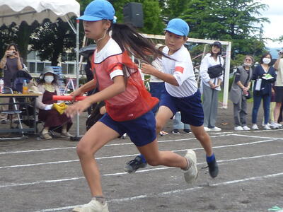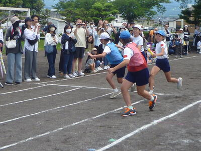 6年生のリレーも手に汗握る、見応えのある競技でした。バトンパスも、走りもさすが6年生でした。前半、後半の2レース行いました。