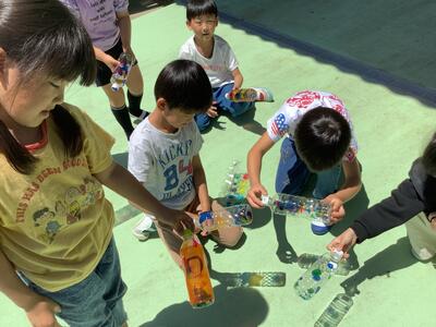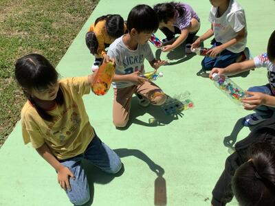 子どもたちはカラーセロファンや色マジックで飾り付けたペットボトルや玉子のケースに光を通しています。
