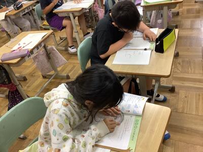 4年生は、新しい漢字を学習しました。筆順は、そら書き(子ども達は「空中ペン」と言います)を何回かしてから、ドリルに鉛筆で書き込んでいきました。短文づくりも行いました。