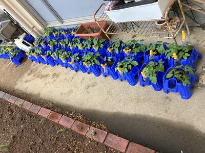 2年生が先日の雨風から避難させていたミニトマトの鉢を、日当たりの良い場所に戻していました。