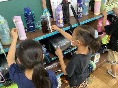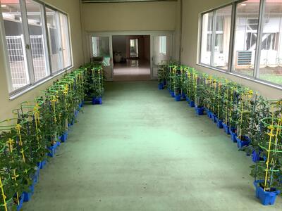 1年生はアサガオの鉢を、2年生はミニトマトの鉢を、今日のうちに避難させました。