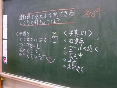 流れる水の働きについて学習しました。ちょうど今日は雨模様。運動場や学校の敷地の様子を観察しながら、学習を進めました。「なぜ、水が流れるところと流れずに溜まっているところがあるんだろう」という教師の質問に、子ども達は生活体験をもとに予想し、みんなで考えていきました。土地の高低差や土地のかたちが関係していることに気が付きました。子ども達が「長伏小の運動場は、雨が降ると沼みたいになるね。」と話していました。