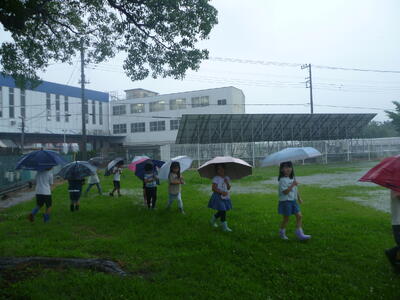 「なつを かんじよう」の学習の様子です。雨の日と晴れの日の違いについて話し合ったり、雨の日に散歩して気が付いたことを表現します。今日は、雨が弱い時間を見計らい、短時間に散歩をしました。「わあ!地面がゆるいね。長靴が少ししずむ感じがする!」「晴れの日は地面が固いのに、今日は柔らかいね!」と友達と会話をしながら散歩をしていました。