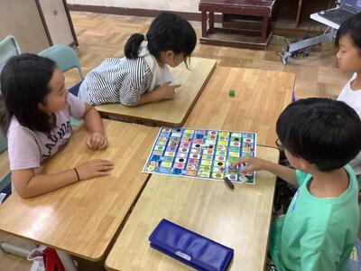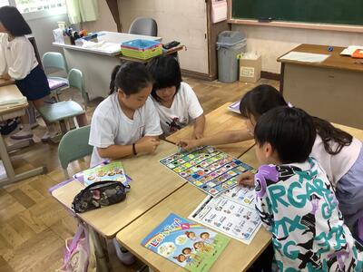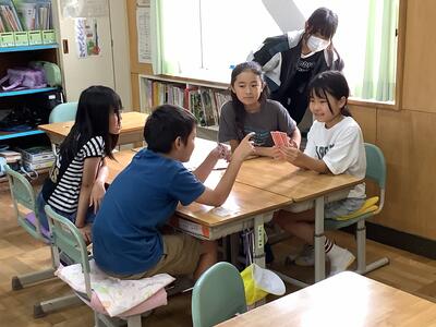 室内ゲームクラブの活動では、コマまわしやトランプを楽しむ様子が見られました。ちがう学年の児童でグループになり、駆け引きをしながらトランプを楽しんでいました。