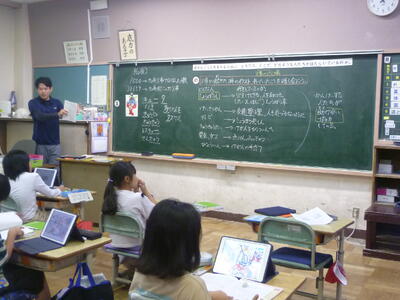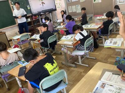 一人一台端末にローマ字で入力ができるよう、少しずつローマ字を覚えています。子ども達は覚えが早いので、やりだすとすぐに覚えていくと思います。学年で先生の話を聞いていました。