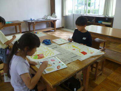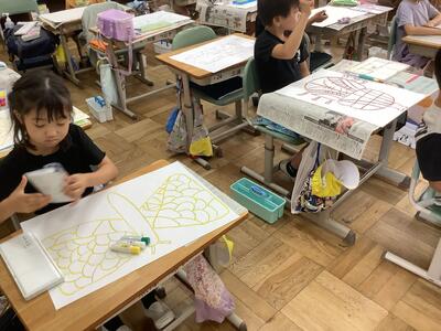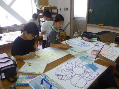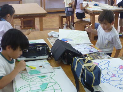 2年生が、4つ切の画用紙いっぱいに生き物の絵を描いています。