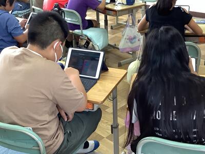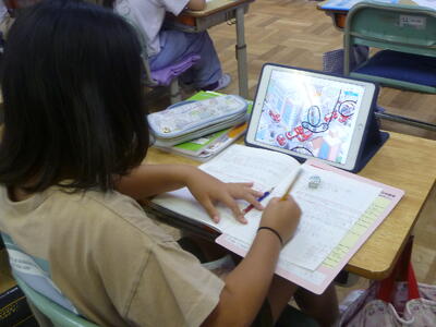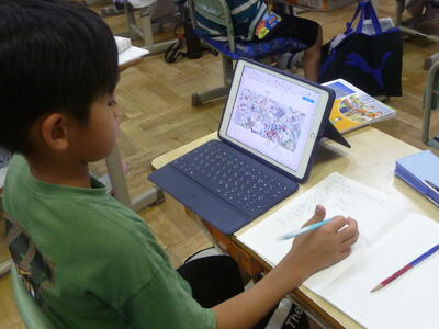 1年生の子どもたちも、「一人一台端末(iPad)」を用いた入力を試みました。