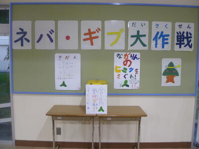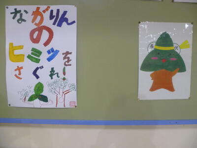 事務室前の廊下には、長伏小キャラクター「ながりん」の吹き流しを飾ってみました。