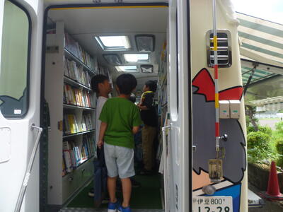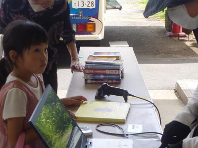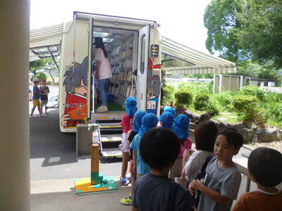 今日は、ジンタ号が昼休みに来る日でした。中郷西保育園の年長の子ども達が、本を借りに来ました。本校の子ども達も、地域の方々も借りに来ました。