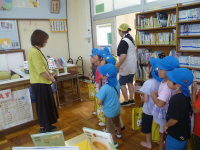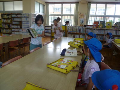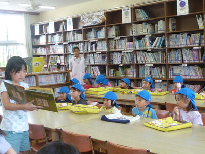 保育園の園児達は、ジンタ号で本を借りた後、長伏小の図書室に寄っていきました。いい機会なので、5年生の図書委員の子が絵本の読み聞かせをしました。園児達は、「ありがとうございました」と、きちんと挨拶をして保育園に帰っていきました。また、来てね!