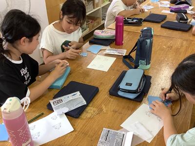 消しゴムはんこクラブでは、長伏小学校のキャラクター「ながりん」のはんこを作っていました。残すべき線を削ることがないように、丁寧に製作していました。