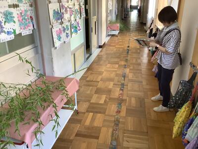 1,2年生の廊下の七夕飾りも短冊がつるされ、完成したようです。