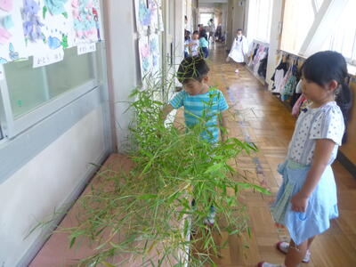 低学年の廊下には、お飾りと願い事を書いた短冊が付けられた笹が飾ってあります。