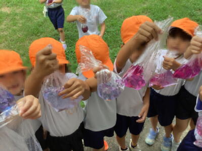1年生が1校時、育てたアサガオの花を使って色水を作りました。