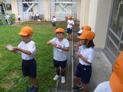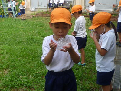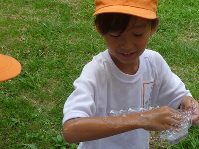 シャボン玉を作って飛ばしました。連続で吹いて風にシャボン玉をのせたり、できるだけ大きいシャボン玉を作ろうと慎重に吹いたり、子ども達は様々な工夫をしました。