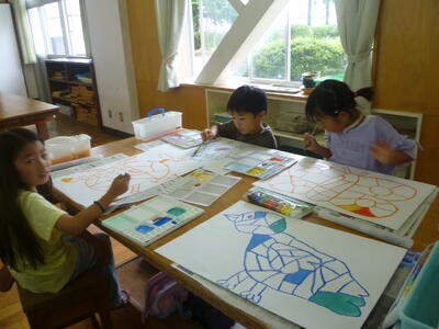 「生き物パズル」の学習の様子です。クレヨンで生き物を線画で描いて、パズルのような模様を作っていました。色はイメージに合わせてぬっていきました。