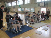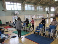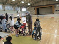 福祉教育の一環で車いす体験を行いました。車いすの仕組みや安全に操作する仕方を教わりました。車いすに乗っている人が安心できるようにするためには、どういう操作が必要か、子供たちは考えていました。
