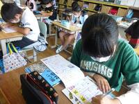 1年生国語の授業です。ひらがなの勉強中です。「ふ」を練習していました。なかなかバランスをとるのが難しい文字です。4つの部屋を意識して、ていねいに書き取りしています。