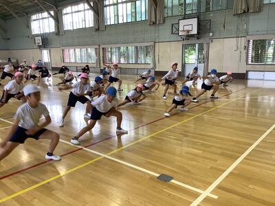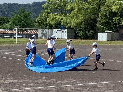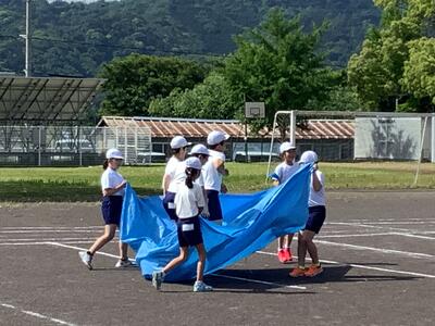 4年生が運動会の団体競技の練習をしていました。できるだけ素早くブルーシートに乗った友達が移動できるように、声を掛け合い、動くタイミングをそろえることを意識して練習に取り組んでいました。本番に向けて、頑張っています。