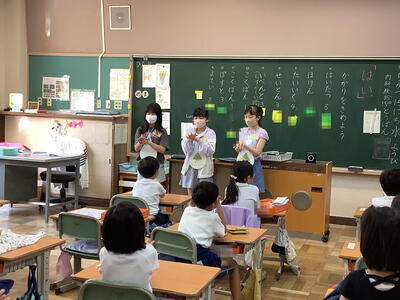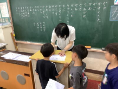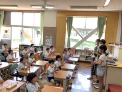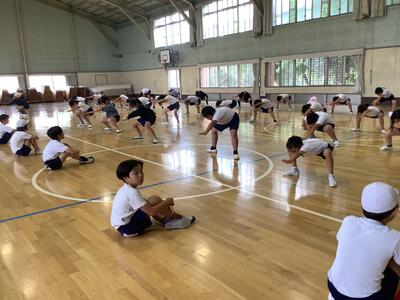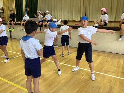 1年生は、お手本を見ながら、歌に合わせて一生懸命練習していました。
