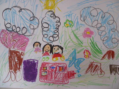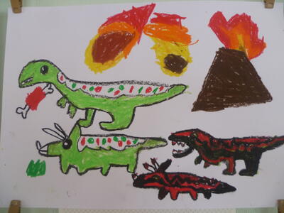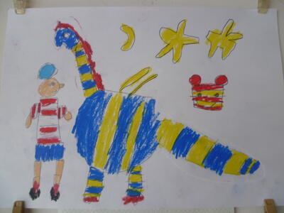 白い画用紙に、クレヨンで絵を描きました。よ~く見ているとお話しが始まりそうです。