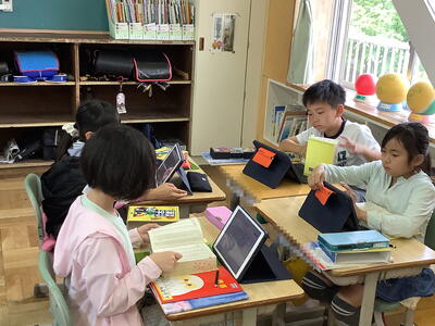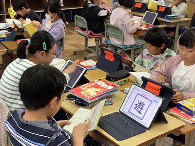 4年生の国語の授業で、漢字辞典の使い方を学習しました。今回の学習では、音訓さくいん・部首さくいん・総画さくいんの方法を復習した後、グループごとに課題となる字の意味や使い方などを調べていました。グループで教え合いながら学ぶ姿勢が見られました。