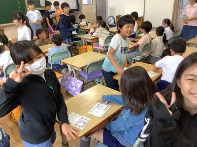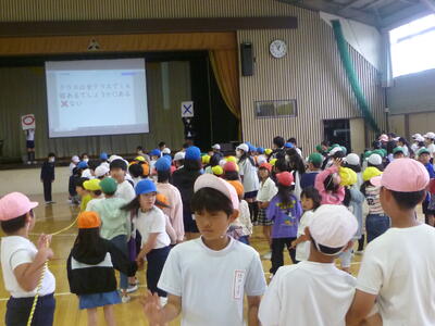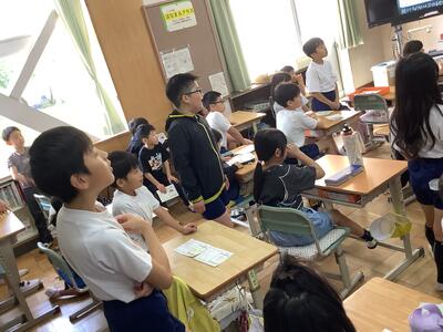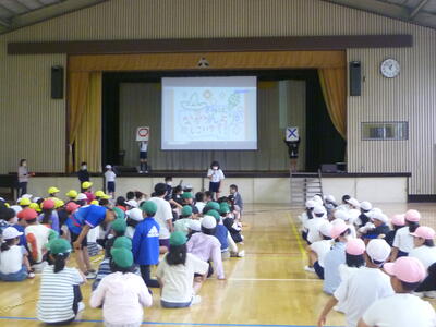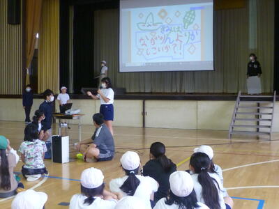 計画委員会の子供達が、全校のみんなが仲良くできるようにイベントを企画・実行しました。「きみはナガリンよりかしこいか?」というテーマで、学校に関するクイズを出題しました。参加した子供達は、○か×で考えました。ペアの友達同士、仲良く参加することができました。