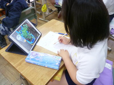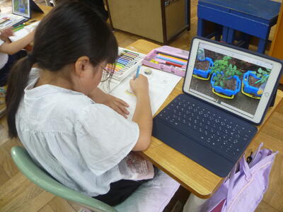 生活科では、ミニトマトの観察を行いました。まだ、実がなっていませんが、子供達は実を描きたくなってしまうようです。たくさんの実を付けてほしいという気持ちの表れですね。