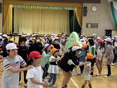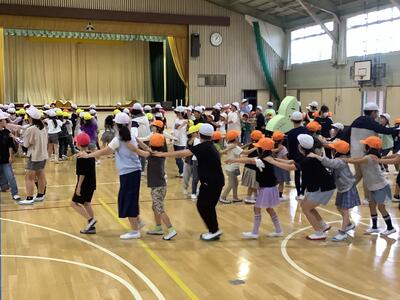 計画委員会の企画で、全校でじゃんけん列車を行いました。昼休みの体育館で全校児童が集まり、色々な学年の子と交流しながら楽しむ様子が見られました。