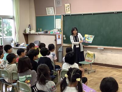 4年生の特別授業で、図書館の方が読み聞かせや本の紹介をしてくださいました。今回は、野菜が大きなテーマでした。野菜を水につけるとそこから育つことやとうもろこしのひげのひみつ等、身近なものでも知らないことがいくつも出てきて、子供たちからは、「え!?」「そうなの?」と思わず声があがっていました。今回の授業をきっかけに、身近なことに疑問をもったり、本に親しんだりする機会にしてほしいと思います。
