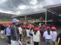 最初に案内された牛舎では、121頭の乳牛が飼われているそうで、「1日30kgのご飯を食べ1日30kgの牛乳を出すんだ」という説明に、子供達は驚いていました。また、2歳で赤ちゃんを産む説明にも驚いていました。