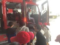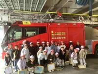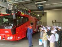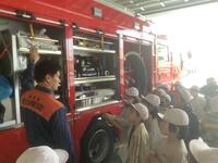 午後からは消防署の見学です。消防隊の人たちは24時間出動するために仮眠でき、お風呂にも入れ、食事も取れる部屋があることを知りました。情報収集室、出動準備室(40秒から1分で着替えて出動)、35メートル伸びるはしご車、ポンプ車、救助工作車などを見学。救助工作車には全員が誌乗させてもらいました。