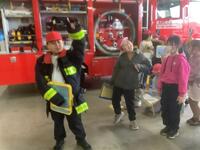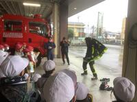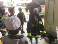 その後は、署員さんによる防火服の早着替えの実演、子どもたちも防火服を着る体験もさせてもらいました。子どもには重さと大きさが実感できました。