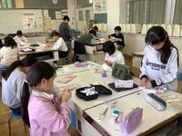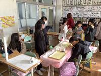 1年生の図工の様子です。ぺったんコロコロという題材で、様々な材料に絵の具をつけ、画用紙に写し取るという、この先に取り組む紙版画にもつながる学習です。今日は、「ぺったん」の部です。プチプチ(緩衝材)やトイレットペーパーの芯などを使い、先生から「手で絵の具をつけるといいよ」というアドバイスをもらながら、思い思いに造形遊びに取り組んでいました。創作の自由度も高いので、このような活動は特に楽しいですね。どちらのクラスからも、楽しい雰囲気が伝わってきました。