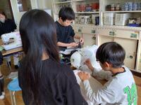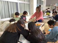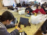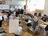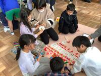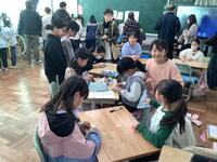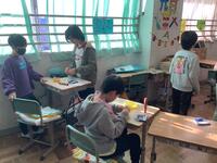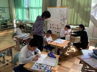 1年生がたくさん拾い集めたどんぐりを利用して、思い思い好きなものを制作しています。かわいい顔を描いて人形にしたり、回ると面白い模様を書き込み駒にしたり、大小様々な大きさのどんぐりを組み合わせて動物を作ったりと、みんな夢中になって活動しています。「上手にできたら、お姉ちゃんにプレゼントしてあげるつもり。」「お母さんの好きな色にしたよ。」など、プレゼントを渡す家族を思い浮かべながら制作を楽しんでいる子どもたちもいました。とてもかわいい作品がたくさん生まれそうです。