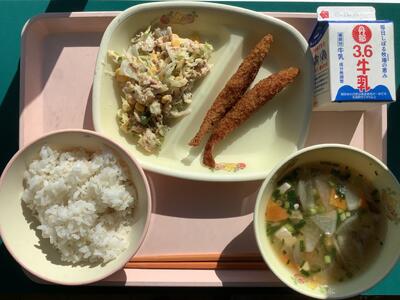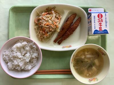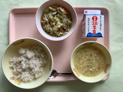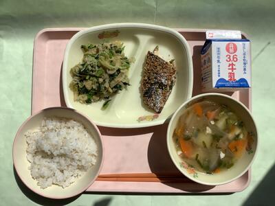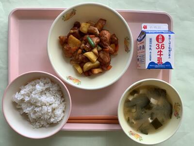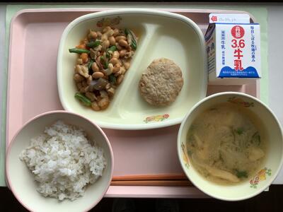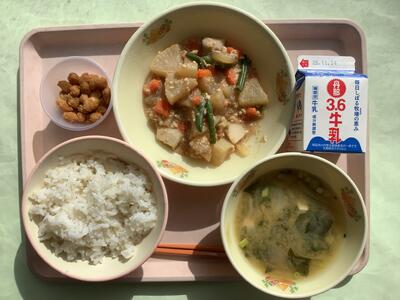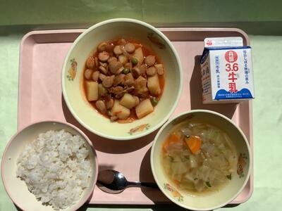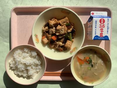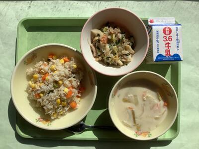 今日は「有機米の日」ということで、本校5年生の子どもたちも生産のお手伝いをした農薬・化学肥料不使用米「にこまる」のお米で炊いたご飯が提供されました。