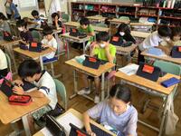 なかよし56組の授業の様子です。夏休み中に開かれる三嶋大祭りについて紹介する記事をタブレットを使ってまとめています。頼朝行列、流鏑馬、シャギリ、パレードなど、見どころが満載の大まつり。どれを取り上げようか悩むのもよくわかります。早く作業が進んだ子や、上級生の子どもたちは、積極的に仲間をサポートします。日頃から助け合いがよくできているなかよし学級です。